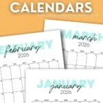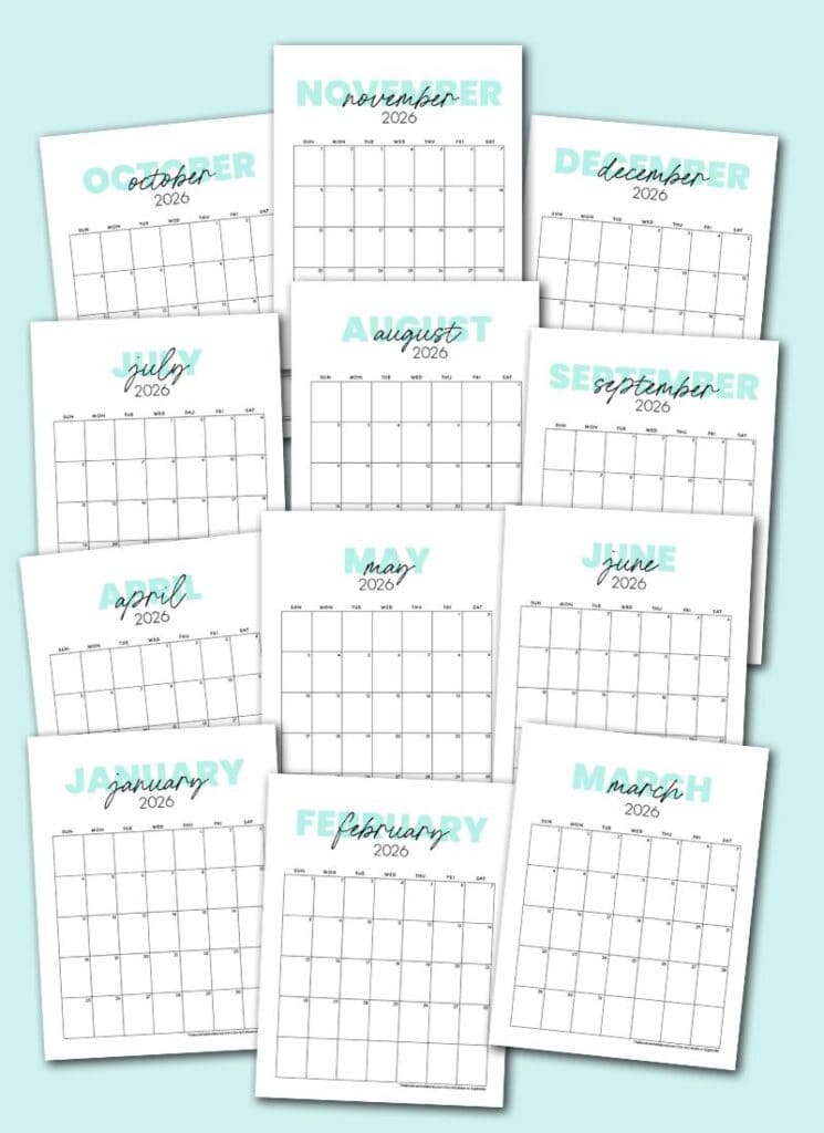 All of these free 2026 printable calendars are US letter-sized vertical monthly calendars. They are all Sunday start and include all 12 months of the year, from January to December. While dated, each day is blank for you to put in appointments or events as needed.