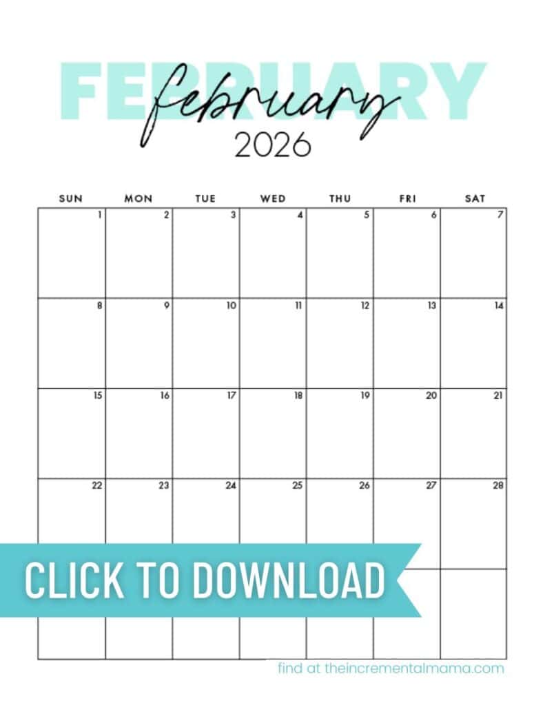 This cute printable calendar design comes in 4 colors. You can get the teal version on this post, or you can click here to grab the same monthly calendar style in pink, purple, or a neutral beige and six other calendar designs.