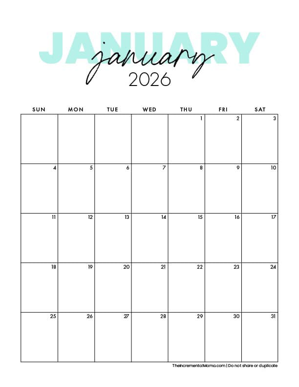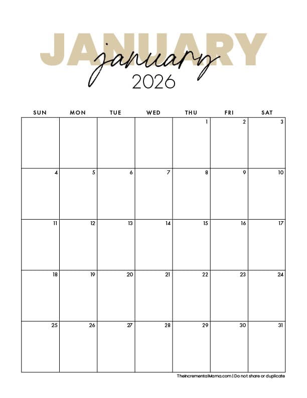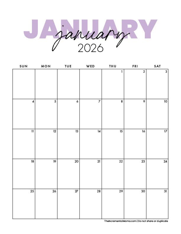 This clean, simple 2026 printable calendar is perfect if you want plenty of space to write. The minimalist layout makes it great for home, work, school, or a family command center. Just print and start planning!