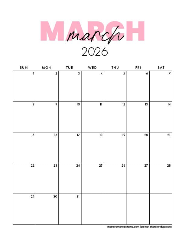 This 2026 calendar features a clean, simple layout with a bold script font for the month title and soft pink accents for a touch of personality. It’s easy to read, pretty to look at, and still gives you plenty of writing space for appointments, routines, school activities, and weekly plans.