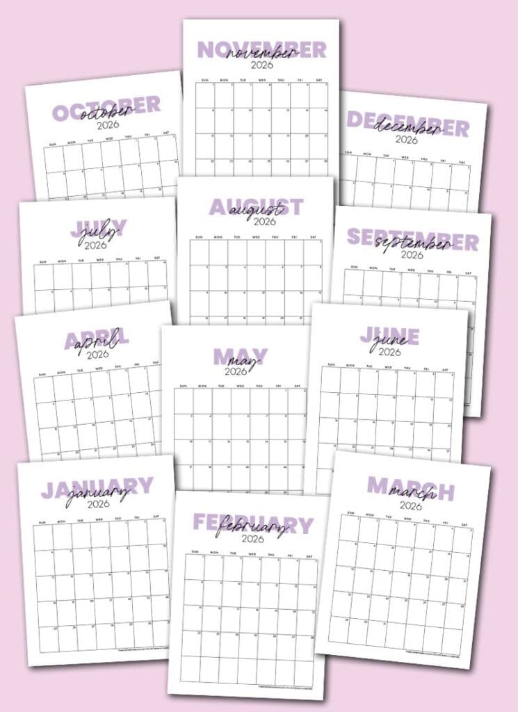 To download all the free printable 2026 monthly calendar PDFs in lavender/purple, you can click here and get all 12 months sent straight to your email inbox.