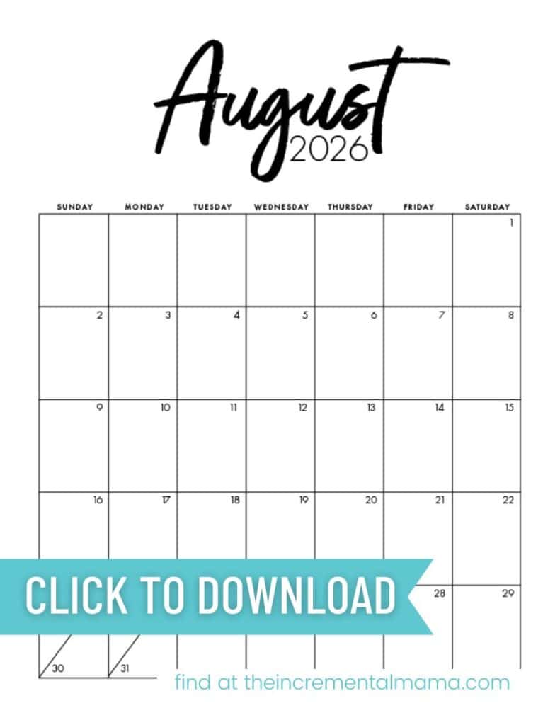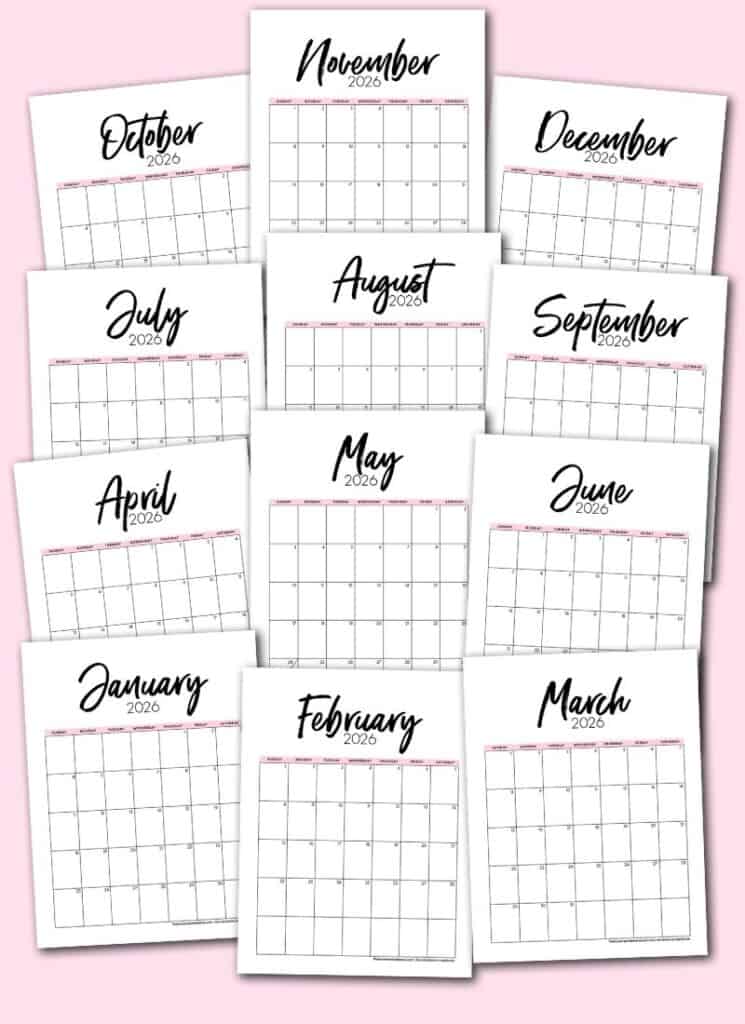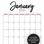 These 2026 monthly calendar templates are in PDF format, US Letter size 8″ x 11.5″ (portrait orientation), and are Sunday start. They are also dated from January 2026 through December 2025. Each month is on a separate page and other than the date, each day is blank and has enough space to write in important dates, appointments, holidays etc.