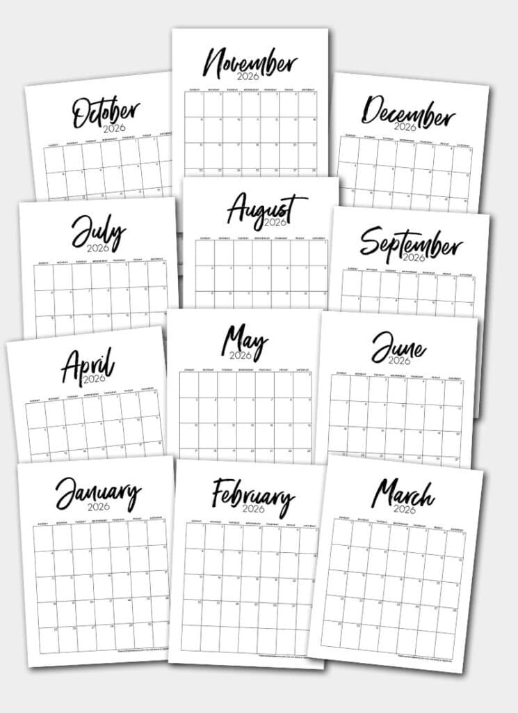 This is a simple black and whiet minimalist calendar design. To download all the free printable 2026 monthly calendar in the black and white design, you can click here and get them straight to your email inbox.