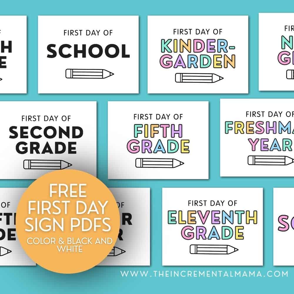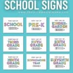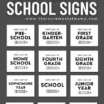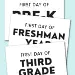 You’ll find first day signs for every grade level, from preschool and pre-K, all the way up through elementary school, middle school, high school…and even some extra higher education signs (especially for those parents going back to school).